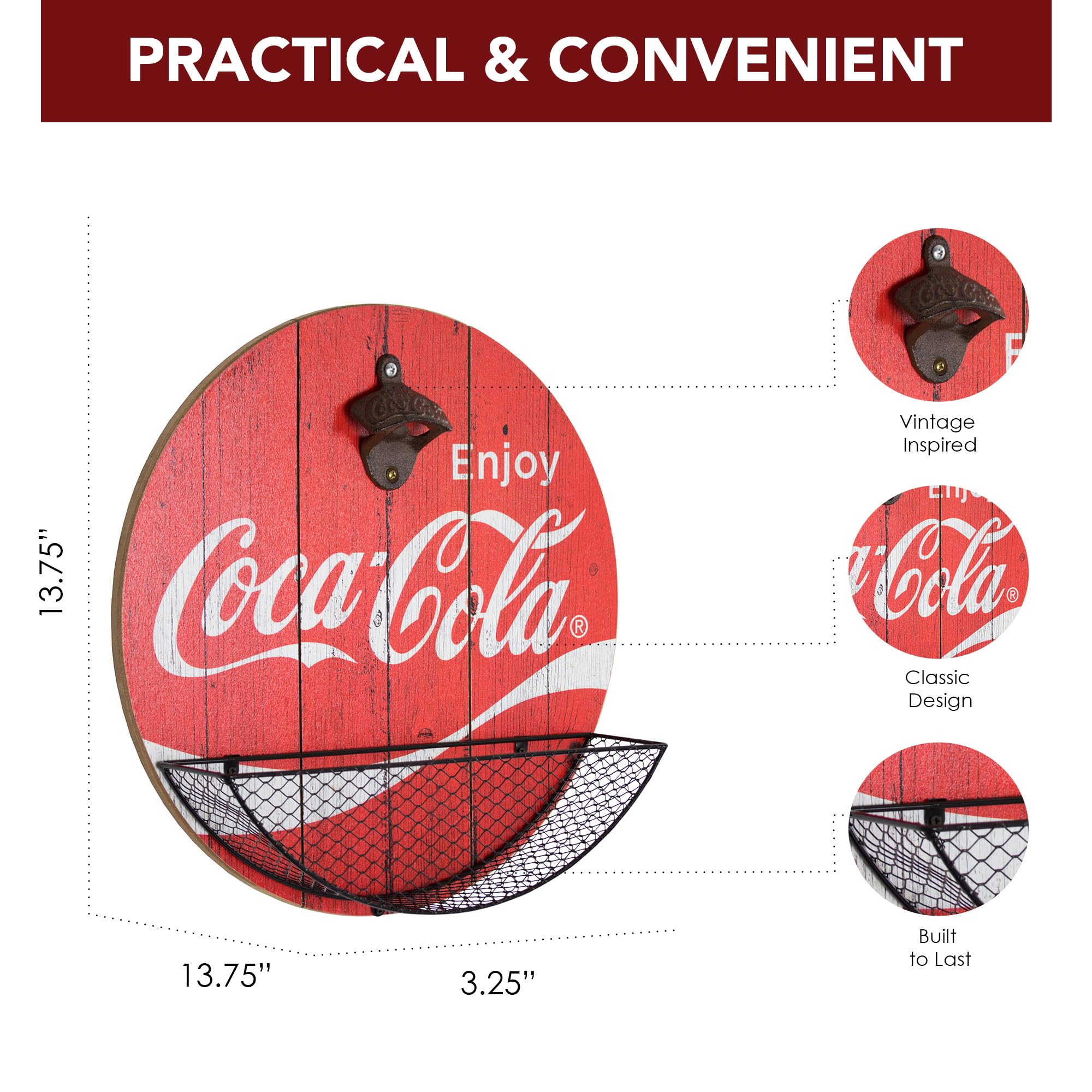 American Art Decor Bottle Opener & Cap Catcher – Wall-Mounted Wooden Beer Cap Collector – Room Decor Accessories for Bar, Man Cave, Garage, Game Room & More (Coca-Cola)