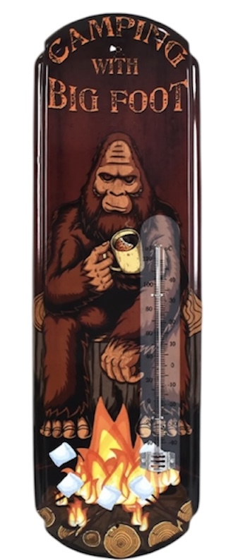 Camping with Bigfoot Vintage Thermometer Sign – Embossed Metal Indoor/Outdoor