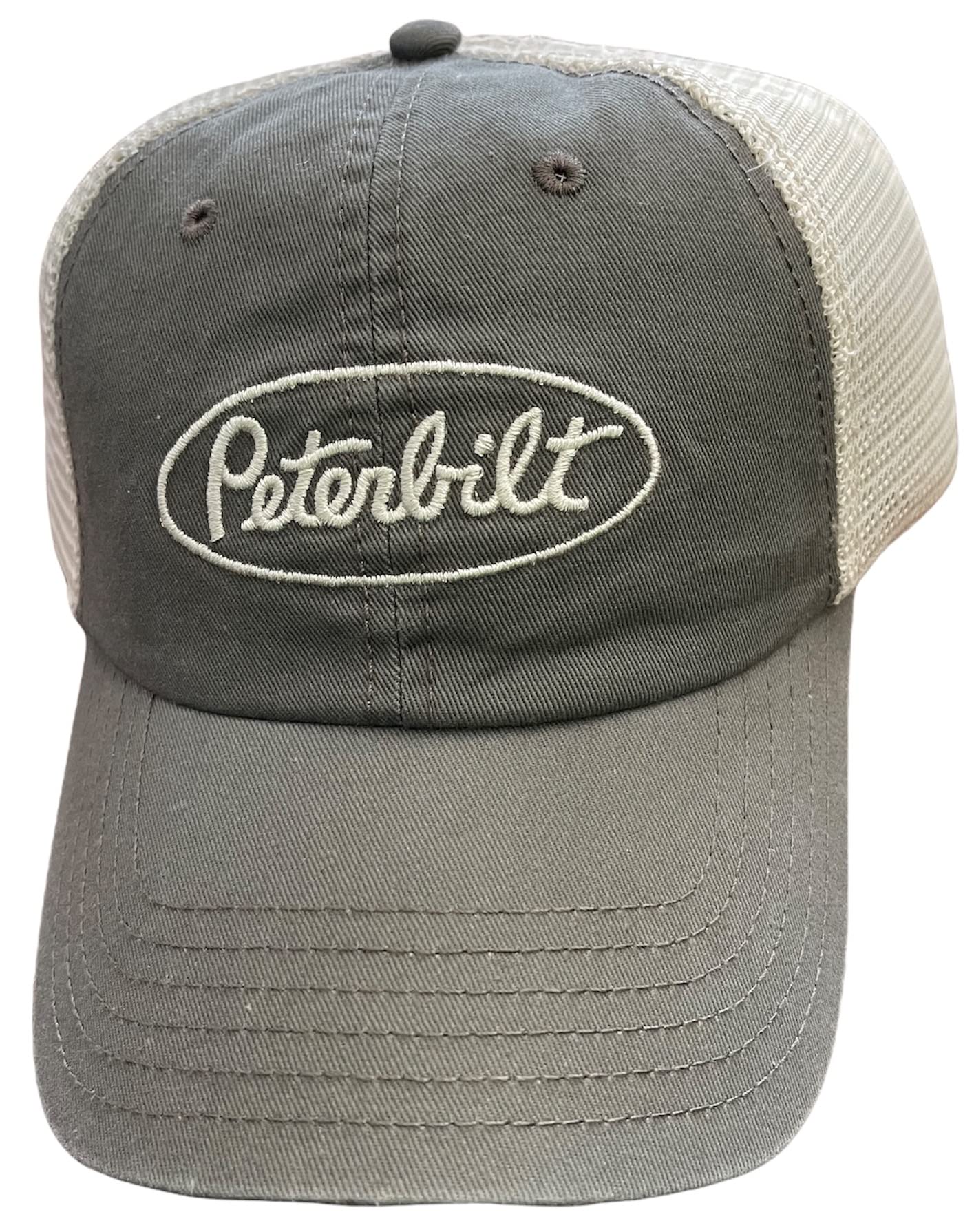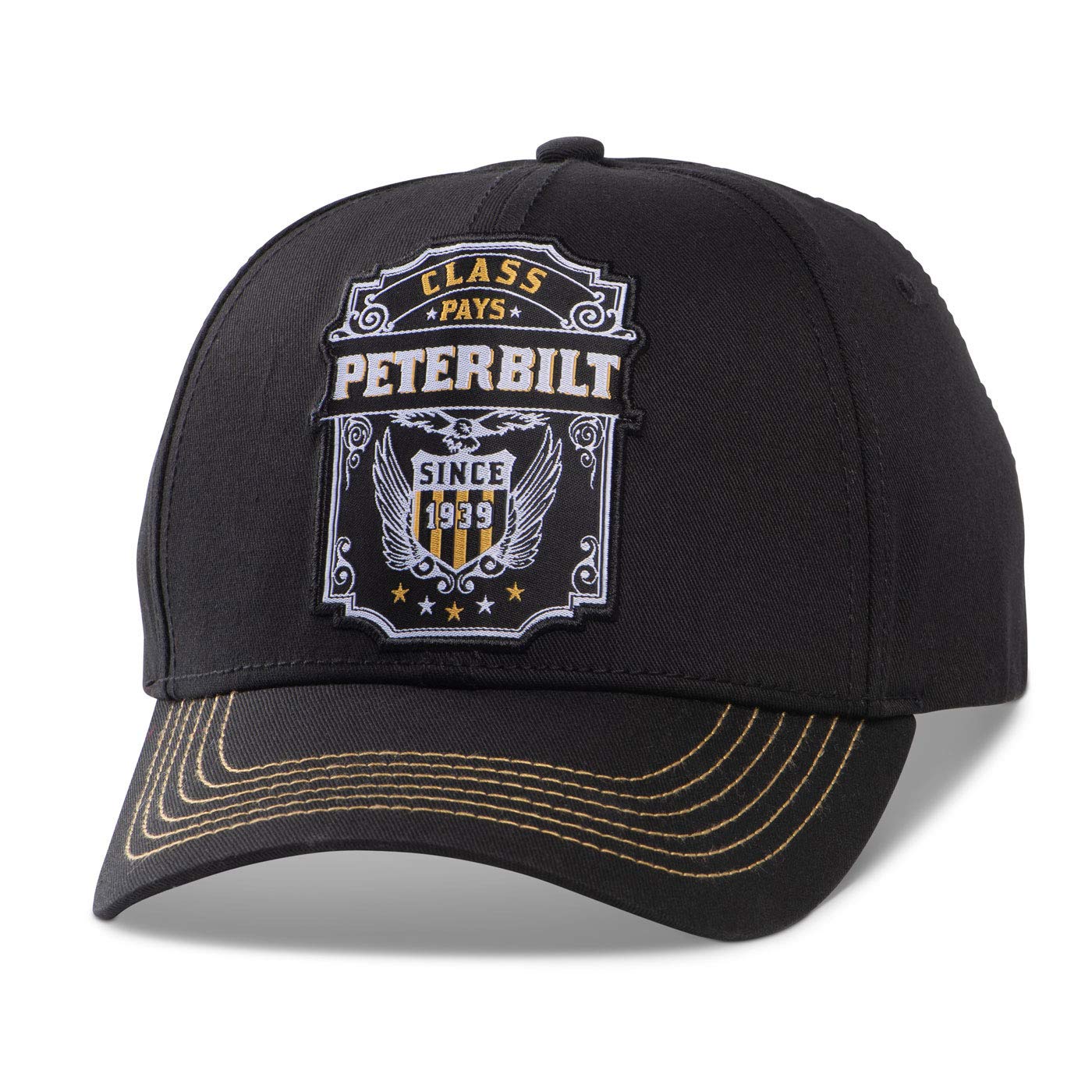 Futuristic metallic decoration puts this cap ahead of its time. Cotton sweatband and liquid metal Peterbilt logo. Chino twill Plastic snap closure Imported